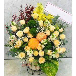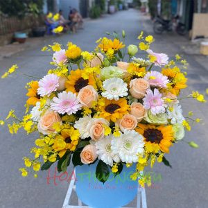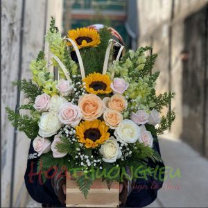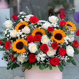 Hộp hoa chúc mừng – hướng dương + hồng kem